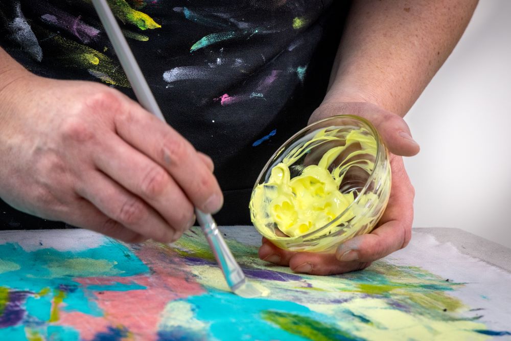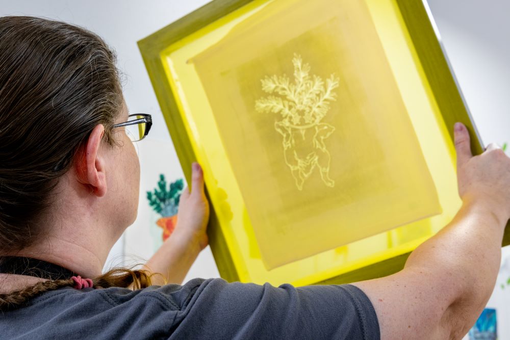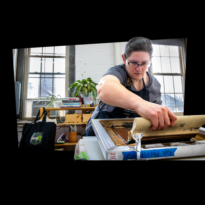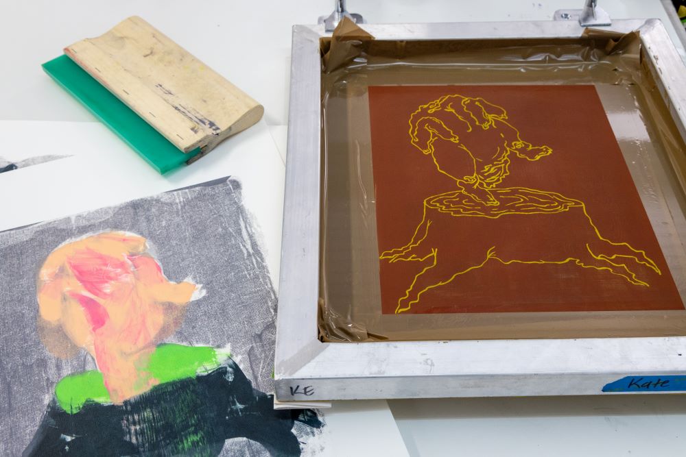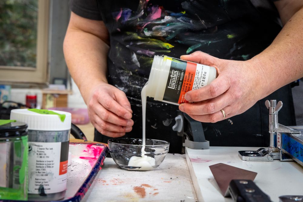 Kate experimented with our pro Silkscreen Medium in the studio, using it mainly with the thick rich texture of Bio-Based and Soft Body. “The medium created a really nice flow for printing, as well as keeping the pigment opacity and increasing the dry time so that I could really work the monoprints as long as I needed.”