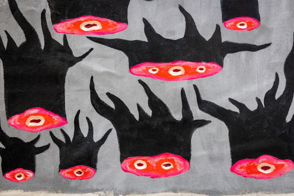 In the Liquitex studio Kate focused on monoprinting and textile work. Spot her feathery chicken leg colander inspired by the Eastern European Baba Yaga story, and meaty tree stump repeats. “Mixing humor with discomfort gives me comfort and is very satisfying as an artist.”