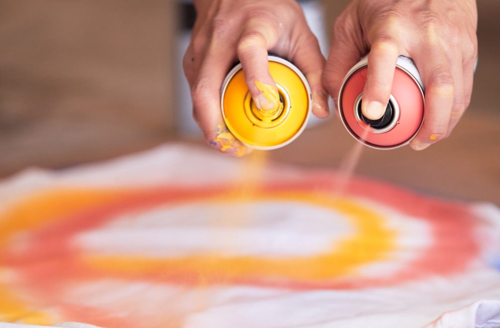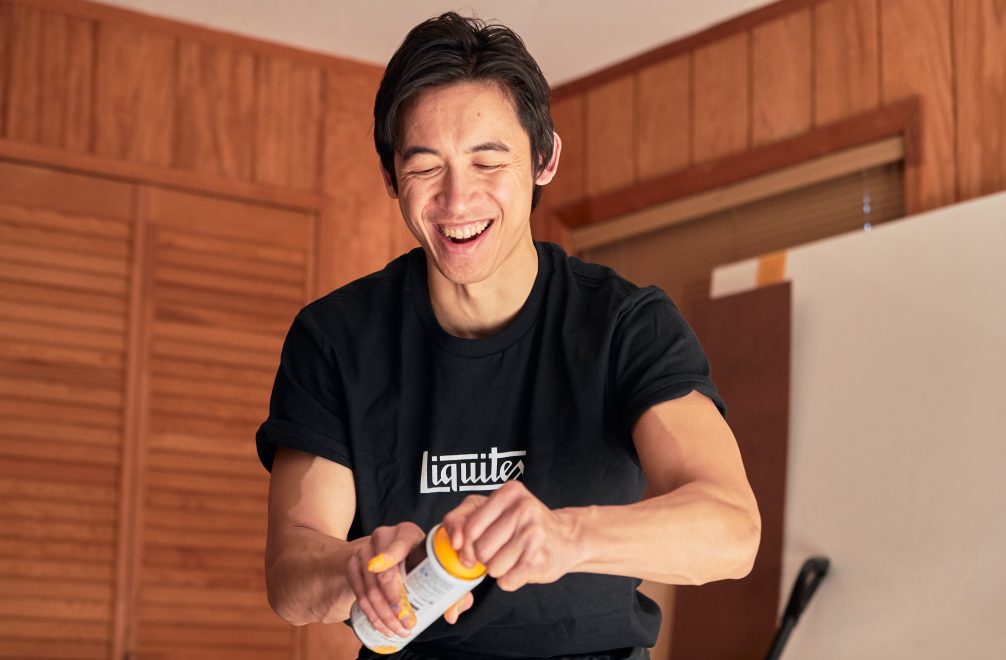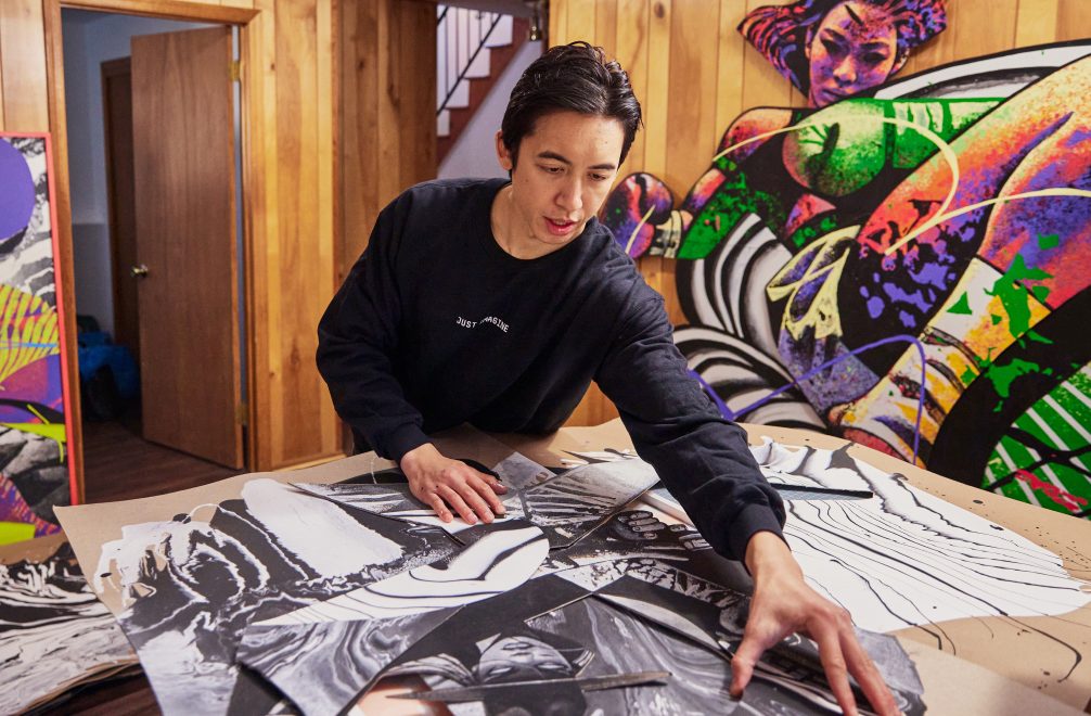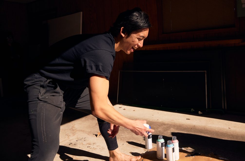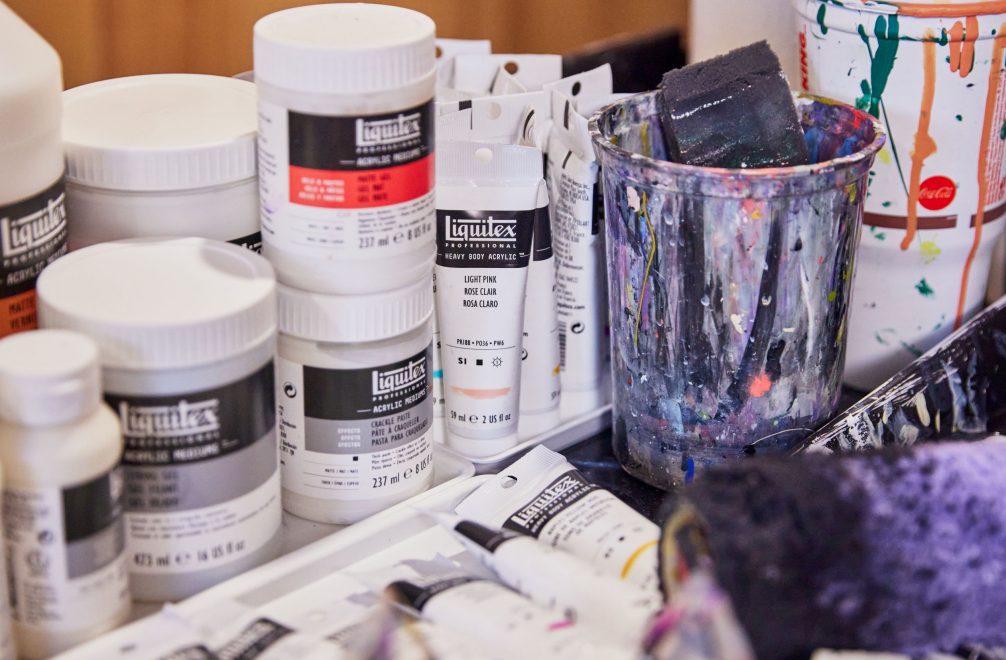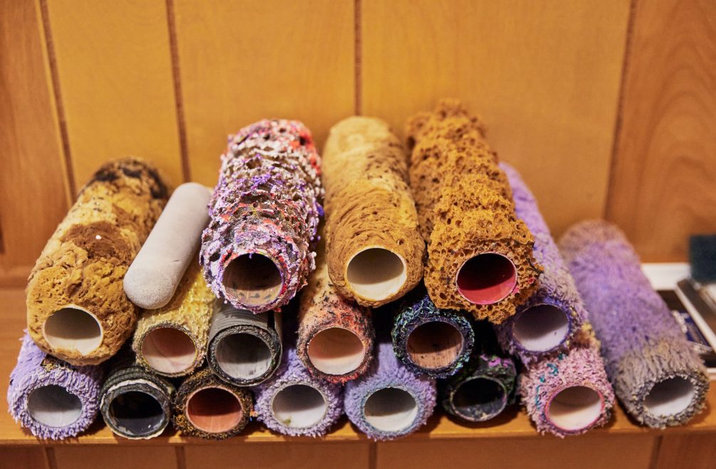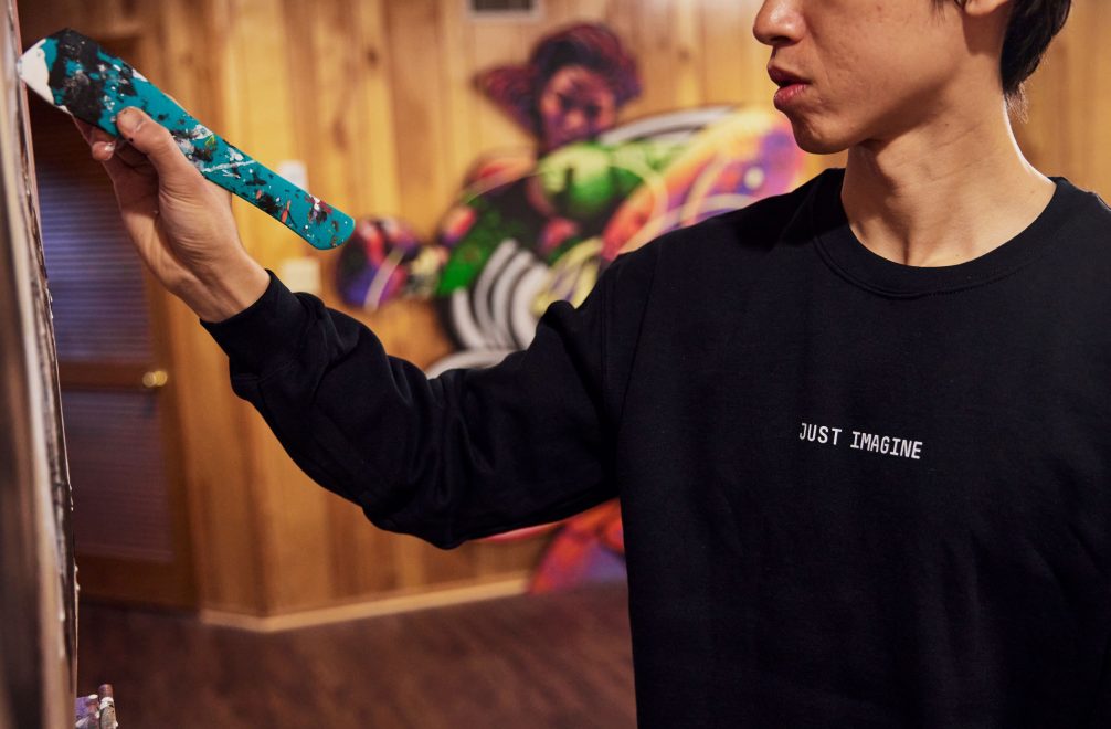“I like seeing unexpected juxtapositions. So, if I am trying to express a certain type of impact, maybe I will use a rough roller and a more aggressive brushstroke. Or, if I am trying to express speed, maybe I’ll paint on a nonporous substrate to get a real watery, liquid effect. And I’ve also been experimenting with paint pours that give me textures that feel like energy.”