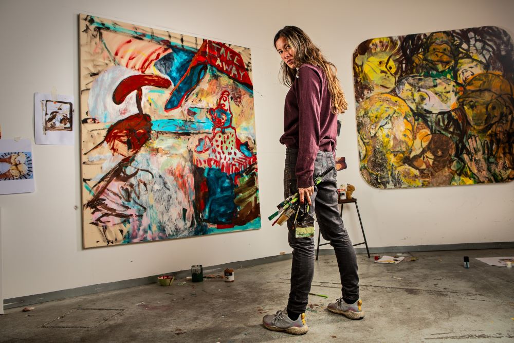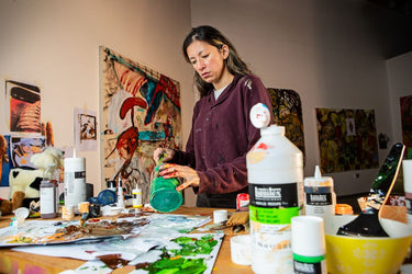 Taking us on a journey filled with teddy bears, bananas and sad-eyed superheroes, we step into the world of Sabrina Shaw, our latest spotlight artist. After completing an MA Painting from Royal College of Art in 2022, Sabrina works mainly in mixed media painting and sculpture, inspired by childhood memories, cartoons and the land of make-believe.