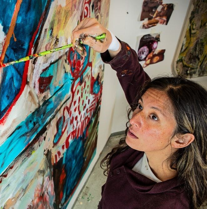 As in any good story, the artist aims to bring elements of suspense and surprise to her narratives, while also referencing her British, Chinese and South Asian heritage. Created with layers of paint incorporating fabrics, paper and texture, the result is a distorted vision, playing with recognition, distance and place.