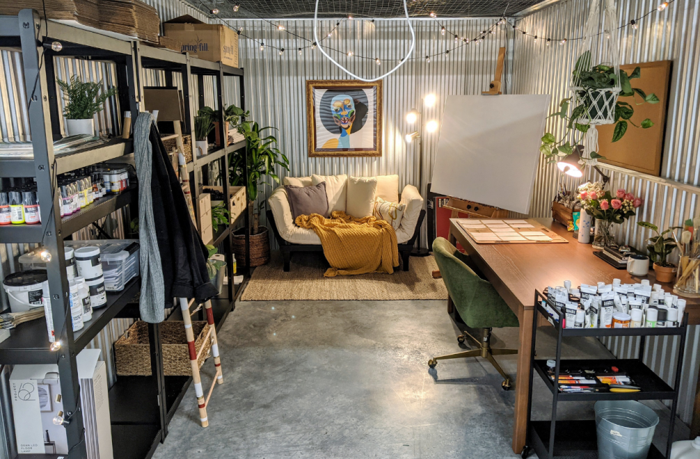 Due to COVID-19, the restrooms are closed in the space, so I don’t stay in the studio long. I’m mainly using the space to pick up materials, store new paintings, and package shipments until COVID-19 restrictions are lifted. I look forward to being in the studio space full-time!