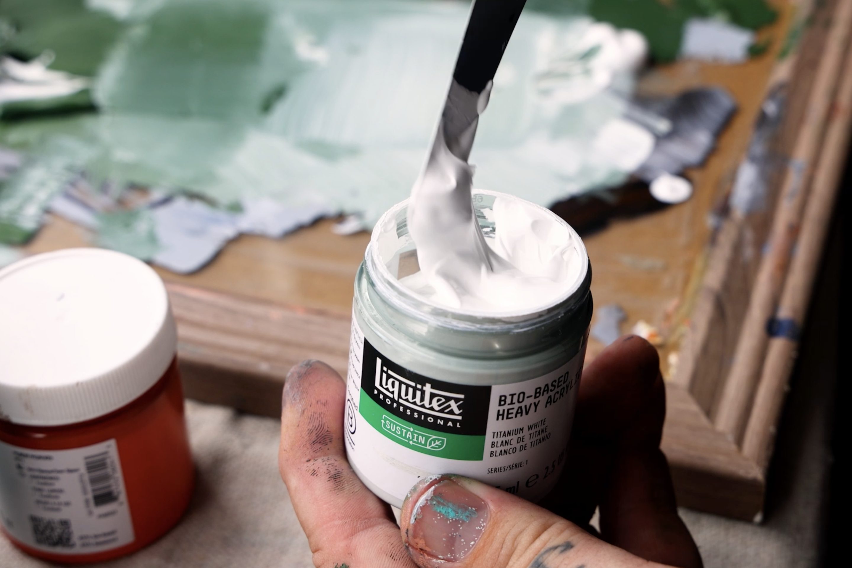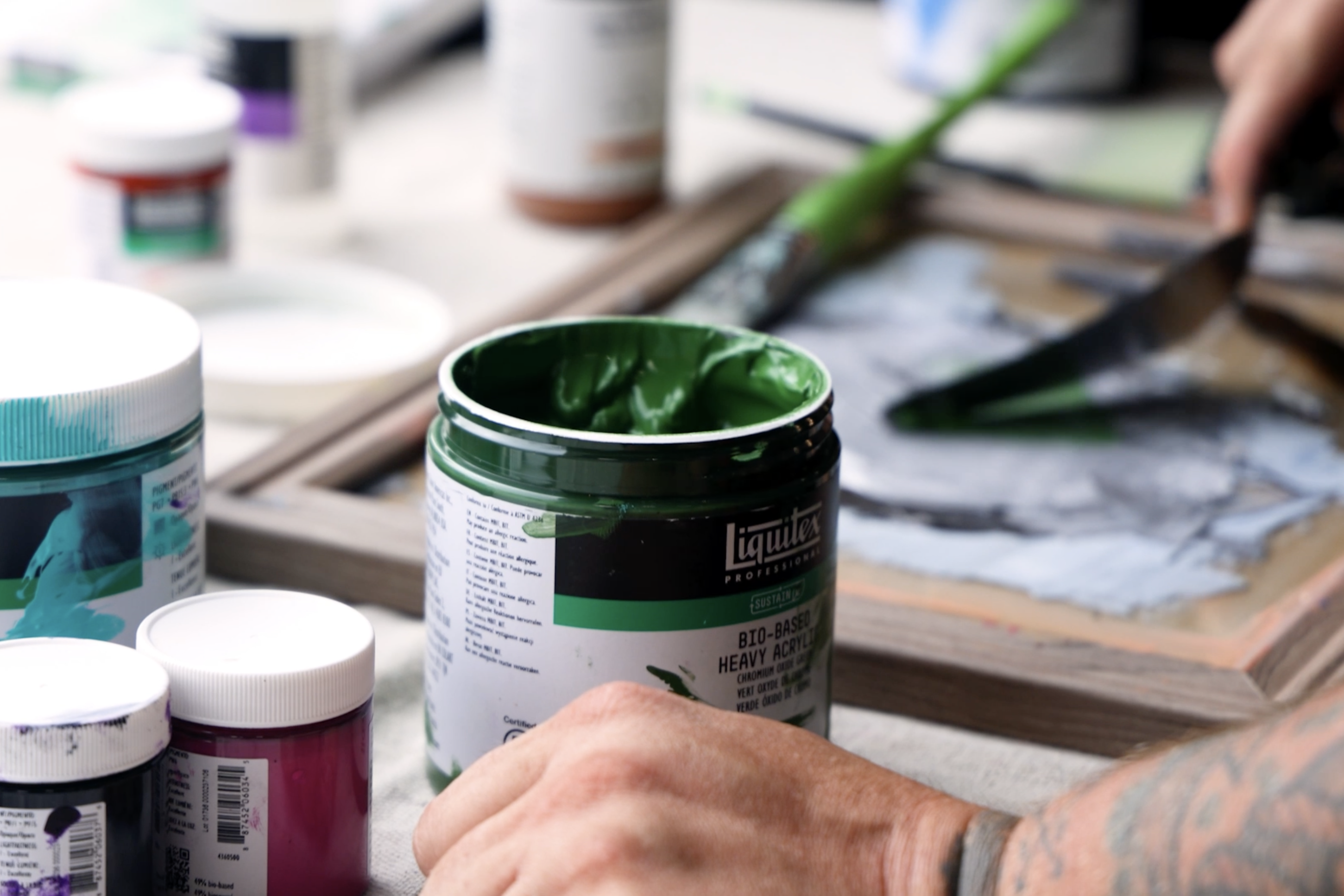 “My first impression of Bio-Based was the vibrancy of the colors, they really pop. Even though it’s bio-based it doesn’t seem that any of the pigment or mixability was compromised. I like to work in acrylic because I like to work FAST but adding a little bit of Flow-Aid to the Bio-Based paint allowed a slower drying time which allowed me to mix and get the colors I want – that’s normally reserved for oil, but I got it from acrylic.”