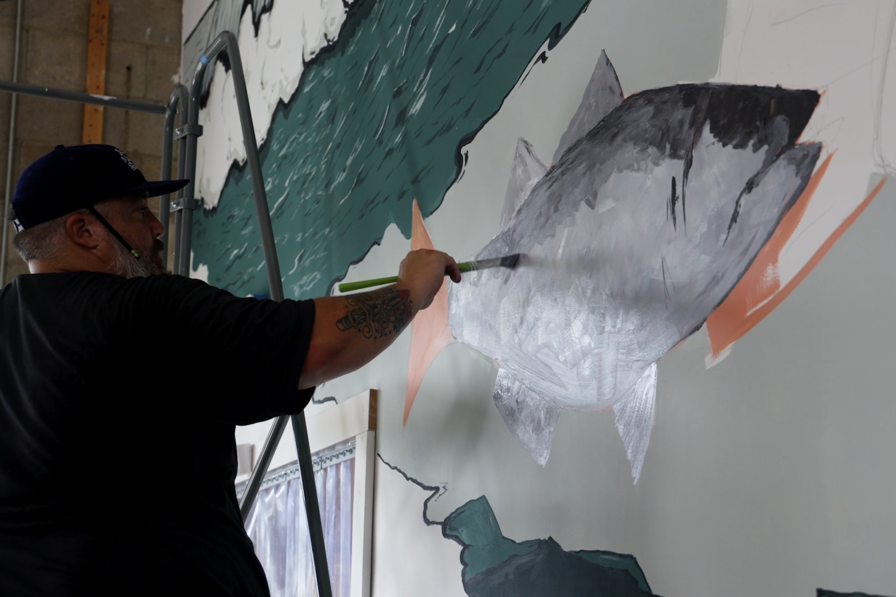 Trawlers, shoals of fish, surf and big horizons… We were delighted to begin collaborating with Jetty and support the creation of a new large-scale work by artist David Macomber in Summer ‘24. David brought a huge seascape to salty life in the flagship store of B-Corp Certified company Jetty located at 176 East Bay Manahawkin, New Jersey, using Liquitex Bio-Based Heavy Acrylic and Mediums.