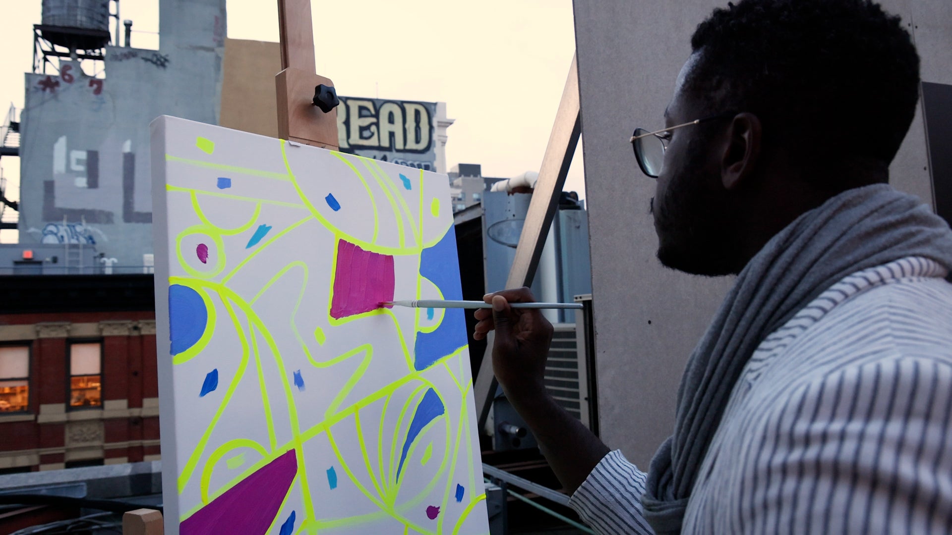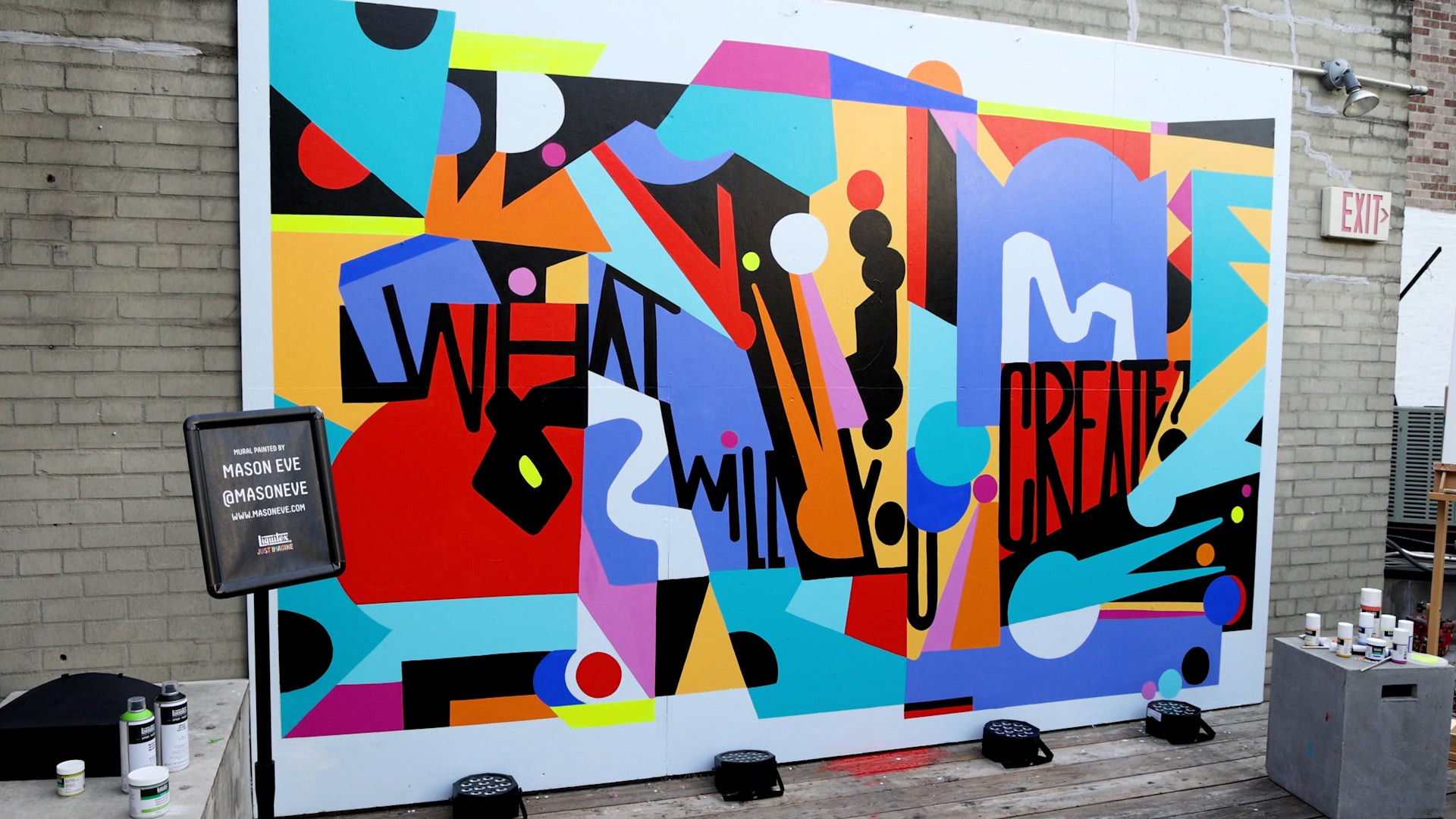 What would you paint to inspire creative thinking? Mason Eve unleashes a bold, color -saturated mural as part of a collaboration between Liquitex and The Yard, a co-working space in NYC. The large-scale artwork covers a huge wall in The Yard’s Flatiron South creative complex.