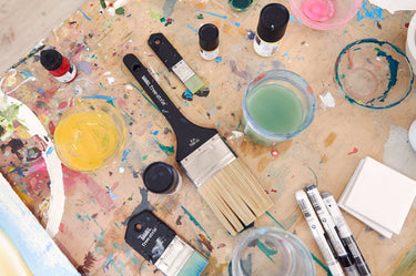 For brushes, our tip is to soak the brush head in a small bowl of Liquitex Pro Pen Cleaner. Leave it for a few minutes and test to see if the crusty bits have dissolved or come away when you rub it. If not, leave for a little longer and test again. You should be able to remove most (or all) of the paint this way, and then rinse with water. If the paint has dried on your knives, you may need to scrub a little more firmly or use a scraper.