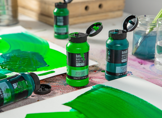 Liquitex Basics Acrylic Fluid is more fluid and has a lower pigment load than Liquitex Professional Soft Body Acrylic.
