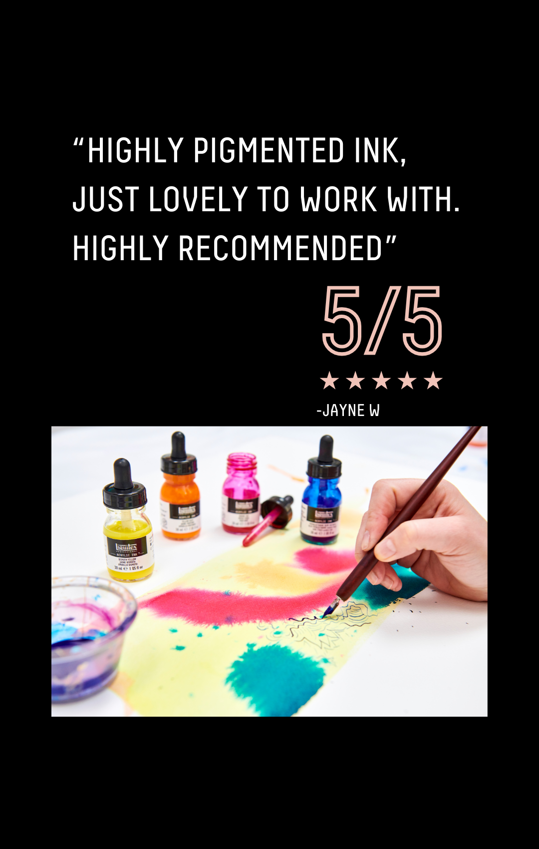 No dyes, no fade, Liquitex Acrylic Ink is lightfast, permanent and smudge proof. Packed with vibrant artist quality pigments for an archival finish, this liquid acrylic lets you move like water. Its 55 color options open up so many techniques and applications, from pouring rivers and pools, to illustration and spray effects.