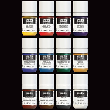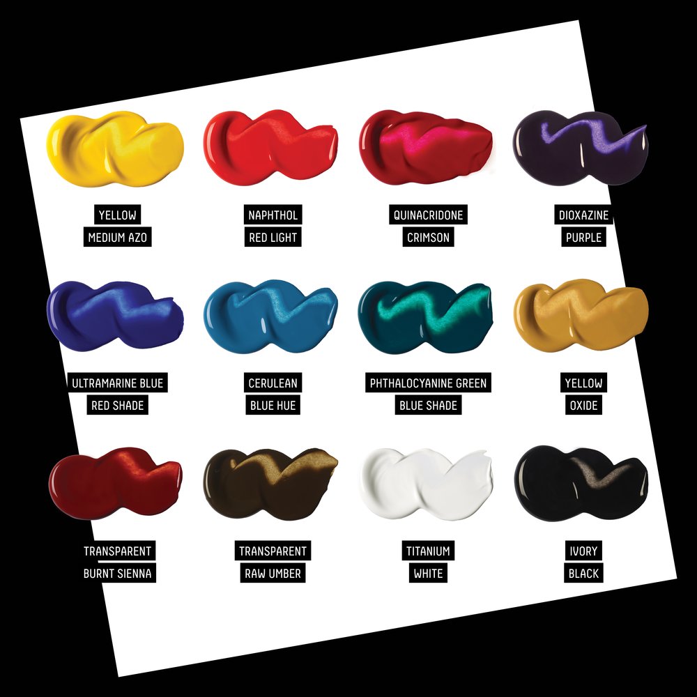 | Set Contents: | 12 x 22ml Professional Soft Body Acrylic - Yellow Medium Azo, Quinacridone Crimson, Ultramarine Blue Red Shade, Naphthol Red light, Yellow Oxide, Transparent Burnt Sienna, Transparent Raw Umber, Phthalo Green Blue Shade, Cerulean Blue Hue, Dioxazine Purple, Titanium White, Ivory Black |
