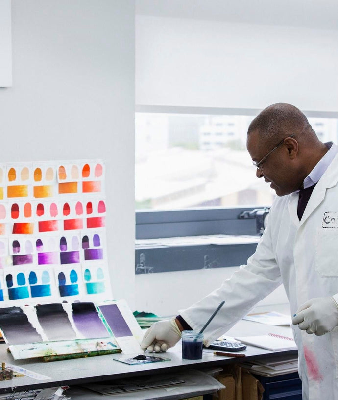 The chemists get to work to turn the idea into reality. They draw on their decades of experience in acrylic technology and collaborate with materials suppliers to source the finest ingredients. A project can take anything from weeks to years to complete, depending on the brief and complexity. Acrylic Gouache took over two years to develop, to make sure it delivers intense pigmentation, high opacity and fluid viscosity across the range. When they have what they believe to be a perfect formula, the chemists put it to the test. A suite of in-house testing technologies is at their disposal - a restricted access room full of machines examining all aspects of the innovation, from light-fastness to opacity, stability and color intensity.